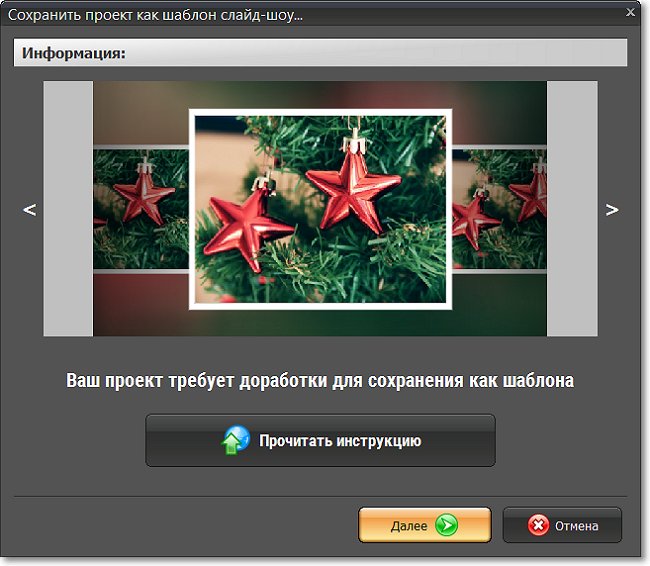 - Шаг 2. В открывшемся окне переключайте слайды с помощью стрелок, чтобы выбрать обложку. Надпись «Ваш проект требует доработки для сохранения как шаблона» появляется всегда, независимо от содержания проекта, и носит рекомендательный характер. Вы можете кликнуть «Отмена» и вернуться к совершенствованию слайд-шоу. Если всё безупречно, смело жмите «Далее».