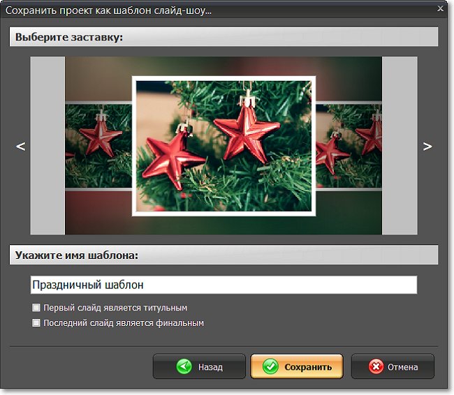 - Шаг 3. Введите название шаблона. Ниже вы увидите две команды – «Первый слайд является титульным» и «Последний слайд является финальным». Если включить эти функции, т.е. поставить галочки, то первый и последний слайды сохранятся в неизменном виде как заставка и финальные титры, что удобно для создания серии тематических слайд-шоу. Оба слайда будут открывать и завершать любой новый ролик, созданный на основе этого шаблона. Если вам не нужна эта функция, просто снимите галочки.