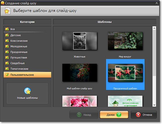 Чтобы применить шаблон, в стартовом окне выберите режим «Слайд-шоу за 5 минут» . В списке категорий найдите группу «Пользовательские» – здесь будут хранится шаблоны, которые вы создали и создадите своими руками. Выделите нужный ролик и нажмите «Далее».