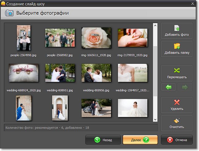 Обратите внимание – программа указывает рекомендованное число изображений, то есть количество JPEG-файлов, которое она «распознала» в видео-шаблоне. Это значение – приблизительное. Вы можете добавлять больше или меньше фото в зависимости от задумки. Если количество добавленных фото превысит рекомендованное, программа будет применять эффекты «циклично». Если в проекте-шаблоне 6 слайдов, а в новом видео – 18, то с 7 слайда эффекты в нём начнут повторятся заново.